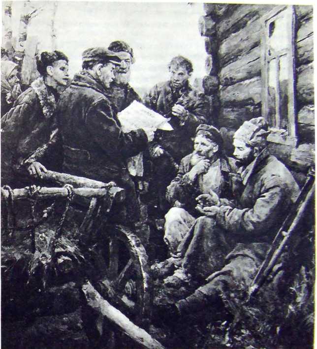 "Первая комсомольская ячейка на селе". На этом полотне художника В. Чеканюка — целая картина жизни деревни после окончания гражданской войны. Мимо кулацких сынков — богатых, гладких — проходят первые сельские комсомольцы: красноармеец, батраки, дети сельской бедноты.