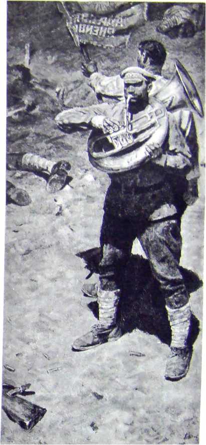 "Интернационал". Тема этой картины художника Г. Коржева подсказана жизнью. Во время ожесточенного боя часть Красной Армии была окружена врагами. Осталось в живых лишь несколько человек. На предложение сдаться последний музыкант военного оркестра заиграл "Интернационал".