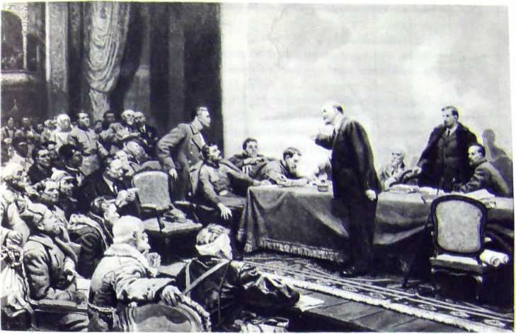Бурлят переполненные залы и коридоры Смольного. Со всех фабрик и заводов Питера, из полков приходят делегаты — узнать, как будет новая рабочая власть решать главные вопросы войны и мира. И каждый хочет увидеть Ленина… Такая сцена изображена на картине художника В. Серова "В Смольном".