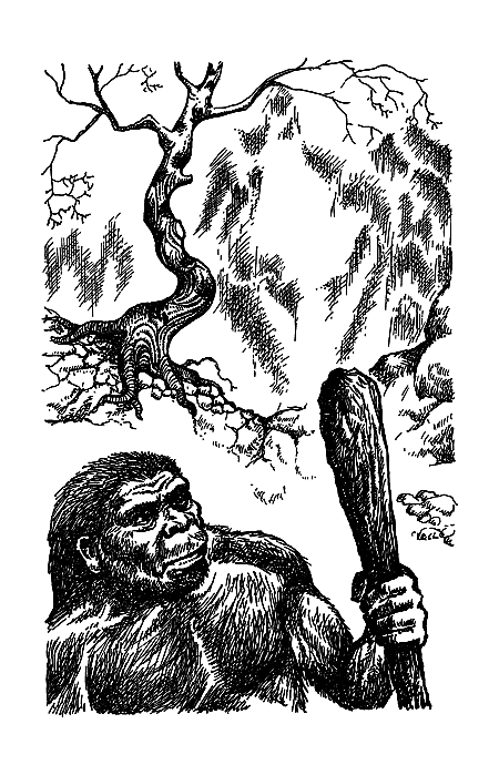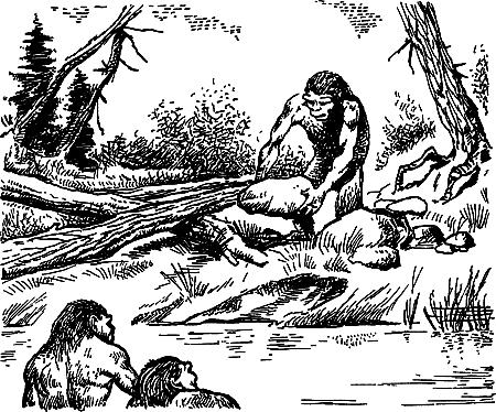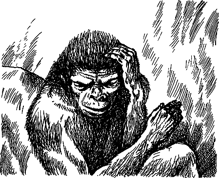 Это и был Красный Глаз. Он осторожно вылез из пещеры и спустился на землю. Не обращая на меня внимания, он стал осматривать местность. Ходил он, круто сгибаясь в пояснице; он наклонялся так сильно, а его руки были столь длинны, что, делая шаг вперед, он касался земли суставами пальцев руки. Такая полусогнутая поза при ходьбе была очень неудобна, и он касался земли пальцами обеих рук, по существу, для опоры. Но посмотрели бы вы, с каким проворством он на своих четырех конечностях бегал! А именно на четырех конечностях все мы были неуклюжи и чувствовали себя очень неловко. Только редкие из нас опирались на суставы пальцев при ходьбе, — это было уже атавизмом, и у Красного Глаза он проявлялся сильнее, чем у кого-либо в Племени.