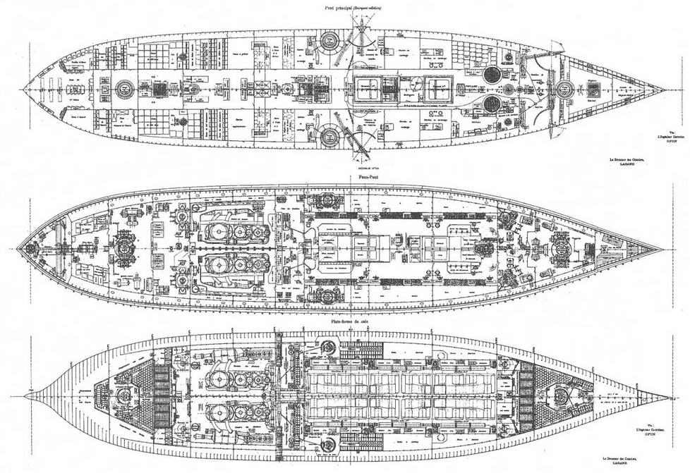 8. Предусмотреть нории, защищённые стальной бронёй из твёрдой стали толщиной 30-мм, для подачи боезапаса, предназначенного для снабжения лёгкой артиллерии, которой вооружены различные надстройки. 9. Заменять торпедами новой модели длиной 5 м и диаметром 45 см, 4,4-м торпеды с удлинённым конусом, предусмотренные проектом. К). Предусмотреть под бронированной палубой, в отсеке Ю, в пустых существующих отделениях в оконечностях трюма хороший резерв продовольствия, достаточный, чтобы обеспечить службу на борту в течение нескольких дней. 11. Добавить в нижней палубе гальюн для высших офицеров. 12. Перераспределить складирование в погребах боезапаса лёгкой артиллерии таким образом, чтобы все боеприпасы 65-мм скорострельных орудий были размещены в центральных погребах. 13. Добавить на каждый борт по второму клюзу для подачи цепей на швартовную бочку. 14. Добавить деревянные фальшкили: центральные и боковые. 15. Заменить пиллерсы мягкой стали внешних продольных переборок профилями. 16. Выполнить погреба боезапаса в соответствии с распоряжениями министерского циркуляра от 23 июля 1888 года: двойная переборка, одна - внешняя из листового железа, другая - внутренняя из дерева, с оставлением между ними воздушной прослойки толщиной примерно в 15 см". Как можно видеть на общих видах проекта, утверждённого к постройке, все пожелания Совета по Работам Лагань принял безоговорочно. Таким образом, закладка броненосца на верфи общества "Форж э Шантье дё ля Медитэранэ" в Ля Сэйн была решена.