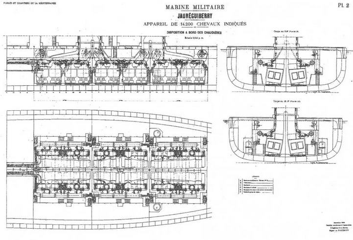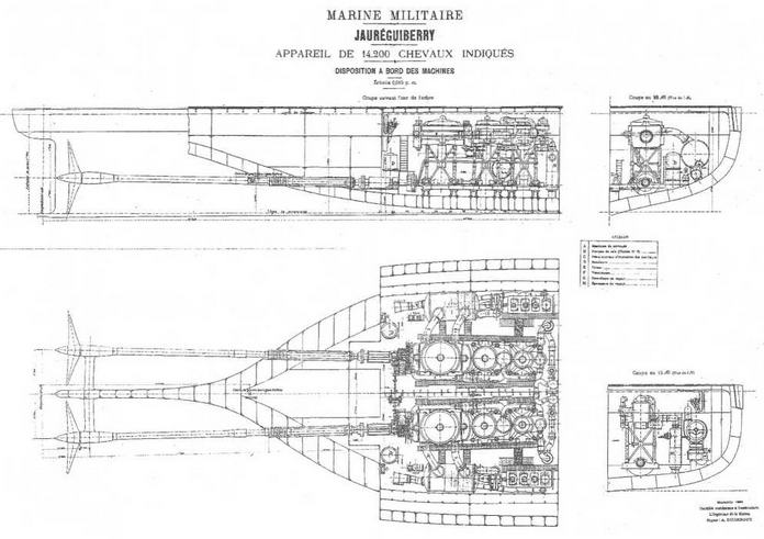 Скорость с натуральной тягой будет 17 узлов; следует предусмотреть струи пара в дымовых трубах, позволяющие достичь на некоторое время максимальной скорости. Следует предусмотреть только два гребных винта. Машины должны быть прочными. Котлы будут мультитрубными системы Бельвиля или аналогичной системы. Проходимое расстояние будет по меньшей мере 4000 миль со скоростью 10 узлов. Общий запас топлива получится прибавлением к цифре, определённой этим условием, количества угля, необходимого на повседневные нужды. Угольные ямы должны быть довольно значительными, чтобы вместить дополнительно, при выходе в море, запас топлива, необходимый для преодоления расстояния в 5000 миль со скоростью 10 узлов. Будут рассмотрены особо все необходимые устройства для облегчения быстрой погрузки угля и быстрой подачи его к топкам.IV. Разные расположения