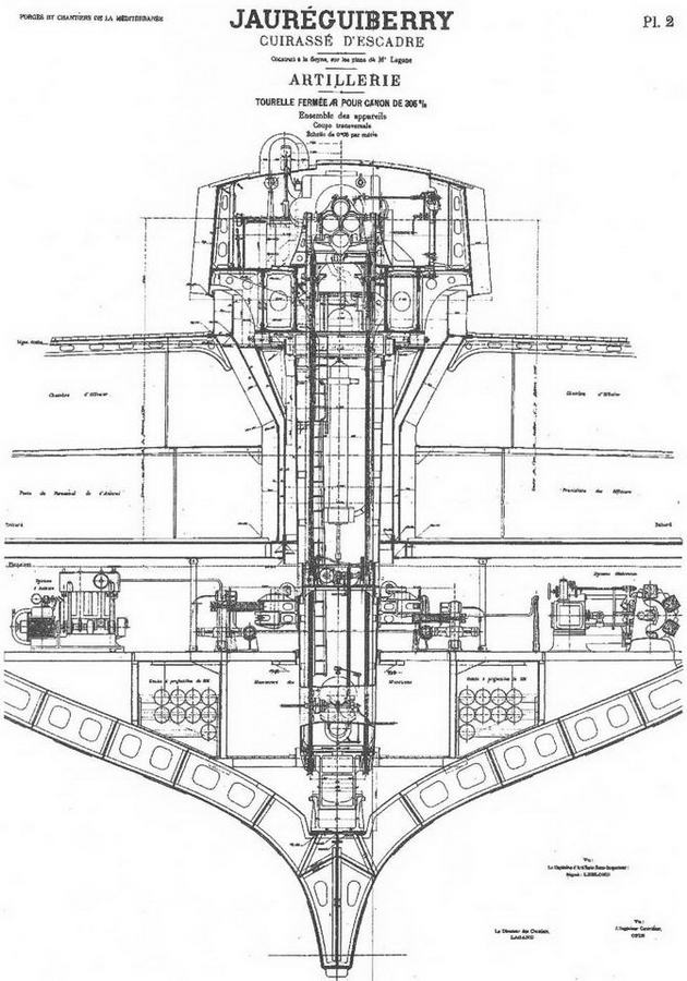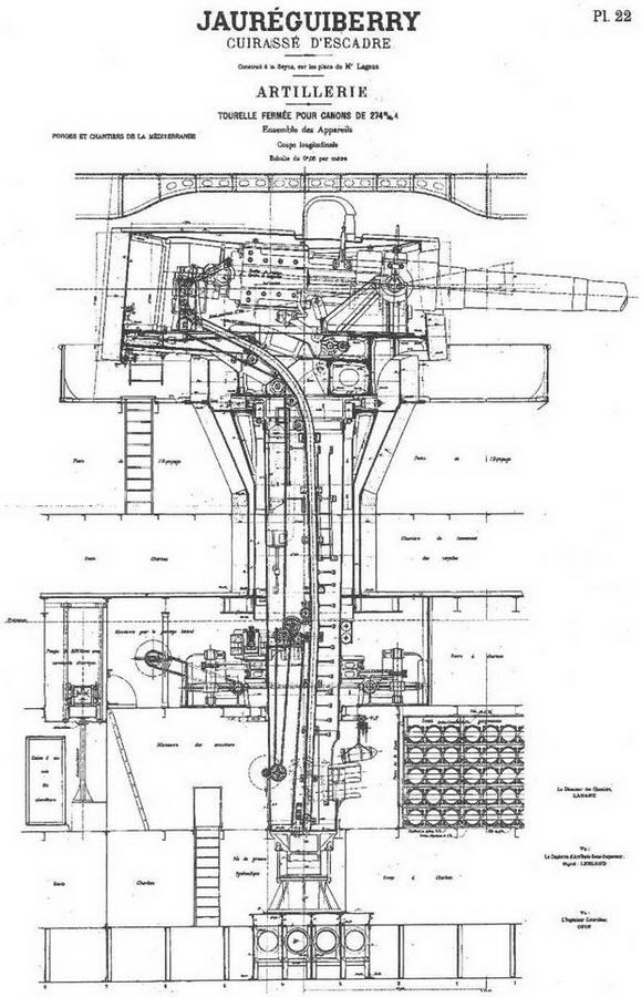 Плиты брони стального пояса будут заказаны частично заводу Шнейдера и частично заводу "Форж эт- ’’Асьери дё ля Марин эдэ Шмэн дё Фэр" в Сэн-Шамон. Паровые машины строились в Марселе в мастерских, которыми общество "Форж э Шантье дё ля Медитэранэ" владело в квартале Манпанти. Машины были самого классического типа для того времени: трёхцилиндровые тройного расширения пара, золотники впуска для высокого и среднего давления - цилиндрические, для низкого давления - двойные плоские. Они управлялись пуском в ход устройством "Стефенсона", как можно видеть на публикуемых здесь чертежах. Напомним, что "пуск в ход" это устройство, обезпечивающее относительное движение золотников, в соответствии с ходом поршней. Благодаря ему могли регулироваться как допуск пара вплоть до остановки и обратного хода, так и установка всех этих элементов в благоприятное положение для пуска. В системе Стефенсона, эта регулировка обеспечена перемещением осей эксцентриковых тяг на подвижном секторе, управляемым вручную, или на крупных машинах, как на "Жорегибери", маленьким паровым двигателем. Котлы модели Ляграфель эд’Але (Lagraffel et d’Allest) согласно проекту располагались в шести котельных отделениях двенадцатью группами, состоящими каждая из двух элементов. Котлы также изготавливались в Марселе. В дальнейшем мы увидим, что они создадут серьезные проблемы во время сдачи корабля в эксплуатацию. 15 октября 1891 года Лагань предоставил пакет чертежей и пояснительную записку Директору артиллерии генералу дю Пэн, в которых он показывает и разъясняет принципиальные моменты артиллерийской части. " 1. Листовая обшивка 30-см башни. Средний диаметр круга вращения горизонтальных катков был сокращён с 3,58 до 3,20 м. Это изменение имело целью сохранить между внутренней стенкой неподвижной башни и внешней стороной погода с катками, кольцеобразное пространство в 45 см, чтобы иметь возможность осмотра наружной стороны каждого из катков. 2. Механизм горизонтального наведения. Он состоит из горизонтального диска из листовой обшивки, приделанного к поданной трубе, и несущего снаружи чугунный обод, имеющий форму С. Его обвивают две цепи Галля, которые постоянно привязаны к обоим его краям. Одно из мест соединения имеет талреп, позволяющий время от времени выбирать слабину. Обе цепи обвиваются вокруг двух шестерён Галля, установленных симметрично с каждой стороны от поданной трубы, и в продолжение того же диаметра. Эти шестерни насажены на две вертикальные оси, несущие другие две шестерни, приводимые в действие двумя бесконечными винтами, которые получают свое движение от двух динамо с повышением напряжения (т.е.соединённые последовательно) один за другим. Это расположение имеет целью обеспечить вращение при помощи пары, действующей в пределах одинакового диаметра, избегая таким образом любой тенденции к изгибанию трубы, в то время как подача напряжения динамомашинами одно за другим призвана уравнивать их действие. В этих условиях, промежуточное кольцо трубы было отменено и ею управляют просто посредством верхней опоры с вертикальными катками и второй опоры малого диаметра, расположенной в её нижней части. Последняя предназначена управлять трубой при её вращении и удерживать её во время боковой качки. Гидравлический пресс под нижней частью трубы, фигурирующий в приложенных 