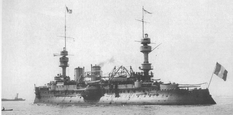 Несчастный случай 9 июня и последовавший за тем осмотр показал необоснованность доверия паяным трубкам применимо к котлу или очень активному испарению, где они проявляли своё покраснение. Замена во всех рядах, подверженных воздействию огня, трубок этого вида непаянными трубками в состоянии предоставить в будущем совершенную безопасность. С этой оговоркой функционирование котлов было удовлетворяющим. Нагревание легко и давление легко поддерживалось, даже при максимальной мощности 14200 л.с., которая соответствует сгоранию только приблизительно 120 кг на квадратный метр колосниковой решётки. Из кривой зависимости мощности от скорости следует, что скорости 17 и 16 узлов требовали мощности только 11000 л.с. и 8200 л.с. соответственно; таким образом, мы видим, что со всеми зажжёнными топками корабль легко достигнет 17 узлов и разовьёт 16 узлов даже с двумя третями своих топок". Как уже говорилось, предварительные испытания артиллерии начались во время выхода 27 мая 1896 года. Эти испытания состояли главным образом в проверке безотказного функционирования механизмов управления башен и элеваторов, но никакая стрельба не выполнялась. Эти испытания будут немного задержаны несчастным случаем 9 июня; они возобновятся 19 августа и тот день не омрачится никакими инцидентами. Следующие испытания состоялись 24-го, провели стрельбы 305-мм носовых и кормовых орудий, а также 138,6-мм спаренных орудий. Огонь был открыт в 10 ч кормовым 305-мм орудием и при первом же выстреле трубка манометра на кольце тормозного цилиндра разорвалась в момент отката. Стрельбу приостановили и возобновили её в 11 ч после исправления этой аварии. Так как жидкость разлилась по башне, необходимо было вновь наполнить цилиндр глицерином. Это наполнение было плохо сделано из-за торопливости, почему давление воздуха в накатнике оказалось недостаточным, и орудие возвращалось в исходное положение медленно. Четыре первых выстрела 305-мм орудия носовой башни с нулевым возвышением были сделаны с удовлетворительными результатами, но пятый причинил очень серьёзную аварию. Правый цилиндр накатника прорвался и все находящиеся в башне тотчас были облиты глицерином; ясно, что само орудие вышло из строя и требовало демонтажа станка для его длительного ремонта. В 3 ч 50 мин начались испытания 138,6-мм орудий. Было сделано пятнадцать выстрелов с результатами, признанными удовлетворительными. Испытания 27-см орудий тогда были перенесены и броненосец возвратился на якорную стоянку в 18 ч.