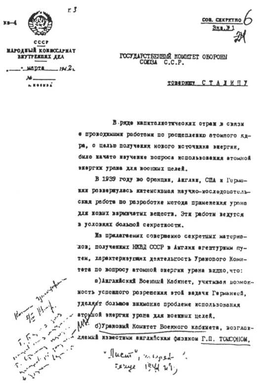 Копия Совершенно секретно ГОСУДАРСТВЕННЫЙ КОМИТЕТ ОБОРОНЫ СССР т.т. СТАЛИНУ, МОЛОТОВУ, БЕРИЯ НКВД СССР т. МЕРКУЛОВУ 28 августа 41 г. Сообщаем содержание телеграммы министерства иностранных дел Англии от 18 августа с.г., адресованной английскому послу в США. Содержание телеграммы получено Разведуправлением НКВД СССР из Лондона агентурным путем. «На параграф 3 Вашей телеграммы № 3708 от 8 августа. 1. Наше отношение к русским целиком строится на строгом взаимном базисе, для того, чтобы заставить их показать нашим представителям в России свои военные заводы и другие об’екты, в которых мы заинтересованы. Пока что русские у нас почти ничего не видели. В ближайшее время им будут показаны заводы, выпускающие стандартную продукцию, однако на экспериментальные об’екты они допущены не будут. 2. Начальники штабов установили порядок, в качестве общего принципа для руководства всем ведомствам, согласно которого русским можно давать только такую информацию или сообщения, которые если бы даже и попали в руки немцев — ничего бы не дали им. 3. С другой стороны, мы уже послали русским некоторые секретные материалы. Ясно, что имеются некоторые заводы, куда они могут быть безопасно допущены. 4. Изложенное выше может быть использовано для общего руководства, в случае если предложение, на которое Вы ссылаетесь в параграфе 1, реализуется. Мы надеемся, что американские власти не пойдут дальше тех лимитов, которые мы сейчас соблюдаем». Начальник разведуправления НКВД СССР (Фитин)№ 6