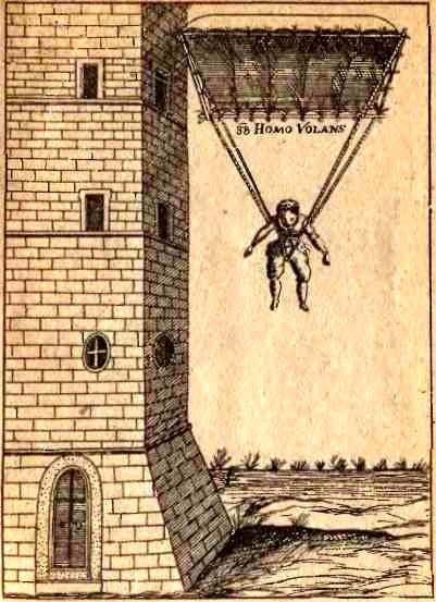 Никто не знает, построил ли Веранчио эту машину и спускался ли на ней он сам или кто-нибудь другой. В истории парашюта об этом нет никаких сведений. Книга Веранчио была известна многим. Но зачем могла понадобиться в те времена машина для опускания человека с высоты на землю? И вот случилось так, что первыми вспомнили о таких машинах люди, решившие бежать из мест заключения. В 1628 году во Франции был арестован каллиграф Лавэн за подделку денежных знаков. Его присудили к тюремному заключению. Форт Миолан, где находилась тюрьма Лавэна, был окружен высокими стенами. Лавэн из простынь и других материалов, бывших в его распоряжении, тайком изготовил нечто вроде паруса и соскочил со стены форта. Он благополучно опустился в волны реки Изер, протекающей под самыми стенами тюрьмы. Переплыв на другой берег, Лавэн пустился в путь, но был пойман и водворен обратно в тюрьму. Спустя несколько лет появился роман, в котором описывается точно такой же способ побега девицы Мелентины из монастыря, куда она была заключена. Мелентина с парусом из простынь спрыгнула с высокой башни прямо в реку и была подхвачена в лодку ее сообщниками. Описывая этот эпизод, автор романа, по всей вероятности, был под впечатлением бегства Лавэна. В 1777 году в Париже профессор де-Фонтань изобрел плащ, с помощью которого, по его словам, человек мог совершенно безопасно спуститься с большой высоты на землю. Плащ был изготовлен из множества птичьих перьев. Чтобы испытать свое изобретение, де-Фонтань обратился к тюремному начальству с просьбой поручить испытание плаща преступнику, осужденному на казнь. Когда всем «смертникам» было объявлено, что благополучно спустившийся будет помилован и получит свободу, выступил некто Жан Думье и заявил, что он готов к испытанию изобретения. Де-Фонтань, надев свой плащ на Думье, поднялся вместе с ним на высокую крышу арсенала и сказал: — Вы только держите руки вот так — и все будет хорошо. Думье спрыгнул и стал плавно опускаться. Вдруг все зрители в ужасе вскрикнули: Думье сделал стремительный рывок книзу… Однако в следующий момент он выправился и благополучно стал на землю. Счастливый испытатель получил тройное вознаграждение: помилование, свободу и кошелек с луидорами от изобретателя. В конце восемнадцатого века в числе людей, которые интересовались законами падения тел с высоты, был Жозеф Монгольфье, живший в городе Аннонэ, на юге Франции.