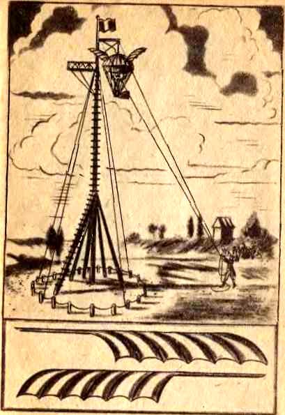 Конечно, мы не верим ни легендам, ни фантастическим рассказам. Но эти легенды говорят нам о том, что и в давние времена люди стремились летать. Начиная с тринадцатого века смелые мореплаватели и путешественники — португальцы, испанцы и итальянцы — отправлялись в еще неизведанные тогда страны Африки и Азии. Магеллан, Марко Поло и другие путешественники рассказали много удивительного про страны и народы, которые им довелось увидеть. Из их рассказов мы знаем, что фокусники одного дикого племени Африки умели прыгать с большой высоты. Вот как описаны прыжки негров в книге «Поучительная географическая библиотека для молодежи», изданной в семнадцатом веке: «Племя чернокожих, которому принадлежало селение, куда мы добрались к вечеру, встретило нас довольно дружелюбно. Нам отвели помещение в одной из хижин, где мы переночевали, хорошо отдохнув от всех невзгод последнего перехода. Утром мы пошли представиться вождю племени. Надо было видеть его радость, когда мы подарили ему трубку с длинным чубуком, украшенным разноцветными лентами с кистями, блестящее ожерелье из граненого стекла и много других мелких безделушек, которым он радовался, как дитя. Желая нас отблагодарить, он на своем гортанном языке отдал какое-то приказание и повел нас на поляну около реки. На другом берегу был довольно высокий холм с обрывистым краем. Нам разостлали на земле звериные шкуры, и мы по приглашению вождя уселись. Вождь сел рядом с нами, указывая жестом на холм и что-то быстро объясняя. Тут мы увидели, как на этом холме появилось несколько человек с большими зонтами из пальмовых ветвей. И вот. по знаку вождя, стоящий около него негр ударял в большой длинный барабан, и каждый раз по этому сигналу один за другим с обрыва спрыгивали люди, держа в руках зонты, и опускались на зеленую лужайку при шумных одобрениях вождя и всей его свиты…»