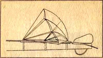 Тут Ленорман вспомнил о недавно прочитанной книге, где описывались путешествия знаменитого Магеллана. Он достал эту книгу и нашел рассказ о прыжках с помощью зонта. Ленорману показалось это возможным. Он решил сам проверить это на опыте. Он изготовил два больших зонта. Но что, если, падая, зонты не выдержат тяжести человека и вывернутся от напора воздуха? Чтобы этого не случилось, Ленорман привязал спицы шнурами к ручке зонта. Эти шнуры были первыми стропами. Ленорман отправился за город, захватив оба зонта. На высоком обрыве стояла большая старая липа, это было удобное место для прыжка. Ленорман взобрался на дерево и, раскрыв оба зонта, спрыгнул вниз. Он остался целым и невредимым, хотя сильно ударился о землю ногами. Теперь надо было обдумать, как устроить такой зонт, чтобы можно было опуститься с очень большой высоты. Ведь нельзя же прыгать с аэростата с такими зонтами, с какими Ленорман прыгал с липы! Конечно, нельзя. Кроме того, висеть в воздухе, держась за палки зонтов, было очень неудобно и тяжело — Ленорман убедился в этом. А если произойдет несчастье на аэростате, то ведь и зонт раскрыть не успеешь. После своего первого прыжка Ленорман уже знал, что опускаться надо медленно, чтобы ослабить силу толчка. Он долго рассчитывал, какой величины и формы должен быть зонт, и наконец, окончив расчеты, сделал модель. Вы видите ее на рисунке.