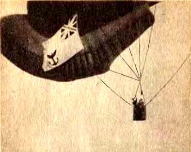 В остов самолета вставляется кабина, в ней находятся пассажиры самолета. Когда надо спасаться, летчик поворотом рычага приводит в действие механизм, который подымает верхнюю часть фюзеляжа самолета, освобождая сложенный под ней парашют. С ним кабина и опускается к земле. Но возможно и такое устройство, при котором кабина упадет вниз и потянет за собой парашют, который затем развернется. Эти способы спасания еще до сих пор не проведены в жизнь, они только разрабатываются. Но грузовые парашюты у нас применяются во многих случаях и особенно в боевой обстановке. Еще во время империалистической войны мне пришлось увидеть гибель нашего наблюдательного аэростата. Несмотря на сильный оборонительный огонь наших пулеметов, австрийский летчик сделал несколько кругов над аэростатом, потом, ринувшись вниз, пролетел под ним и выстрелил в баллон зажигательной ракеткой. Аэростат сейчас же вспыхнул. Наблюдатели успели выпрыгнуть из корзины и спаслись благодаря парашютам. Но все, что было в корзине ценного, разбилось, поломалось, испортилось: телефон, пулемет, наблюдательные инструменты. Мне хотелось разработать конструкцию корзинного аэростатного парашюта, которая спасала бы не только людей, но всю корзину с имуществом. Такой корзинный парашют я и разработал. Когда надо спасаться, пилот поворачивает штурвал, находящийся у него над головой, корзина отделяется от аэростата и падает. Она тянет за собой парашют, который раскрывается и опускает корзину на землю. В 1924 году я предложил этот проект. Проект был одобрен. Корзинный парашют «РК-4» построили и испытали. Корзину сбросили несколько раз. При испытании многие красноармейцы обращались к командиру: — Товарищ начальник, дозвольте сесть в корзину! Но пока шли только испытания, этого никому нельзя было разрешить. Тогда бойцы посадили в корзину свою любимую маленькую собачонку. Из высокой корзины она никак не могла выпрыгнуть, и они за нее не боялись. Нужно было видеть восторг бойцов, когда корзина, тихо опустившись на землю, была затем повалена парашютом набок и из нее с громким радостным лаем выскочила их любимица. Испытания этого парашюта прошли очень удачно. Он был принят на снабжение воздухоплавательных частей нашей РККА.