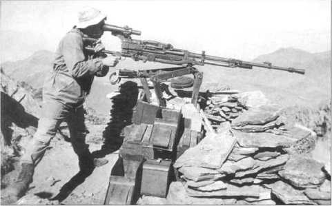 6. Снайперы в частях 40 Армии несли службу в дозорах и на заставах, а также использовались для решения специальных задач в боевых выходах и засадах. Снайперская стрельба требовала профессиональной подготовки. Обучение стрелков для Афганистана наладили в центре «Шерабад» ТуркВО. Курс учебы, помимо освоения оружия, навыков и специфики снайперского дела, учитывал особенности маскировки и стрельбы в горно-пустынной местности, где соседство прогретых солнцем и тенистых склонов создавало множество воздушных потоков, вместе с солнечной рефракцией в «дрожащем» горячем воздухе серьезно сказывавшихся на точности стрельбы. Имелись снайперские прицелы для автоматов и пулеметов, но штатным оружием снайперов оставалась специальная винтовка СВД с оптическим прицелом ПСО-1.