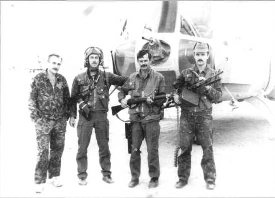 Вертолетчики Газни с командиром разведгруппы (с трофейной винтовкой), на бедре которого видна объемистая пластмассовая кобура АКС-74У. Разработанный для летного состава жилет носимого аварийного запаса НАЗ-И, скроенный из плотной синтетической ткани оливкового цвета, служил для размещения радиостанции «Комар», пистолета ПМ, обойм к нему, пары автоматных магазинов, сигнальных патронов и перевязочного пакета. Жилет заслужил признание не только в авиации, но требованиям к «боевому» он все же не удовлетворял, в первую очередь из-за малого носимого боезапаса, будучи ориентированным на нужды летчика в расчете на скорую эвакуацию.