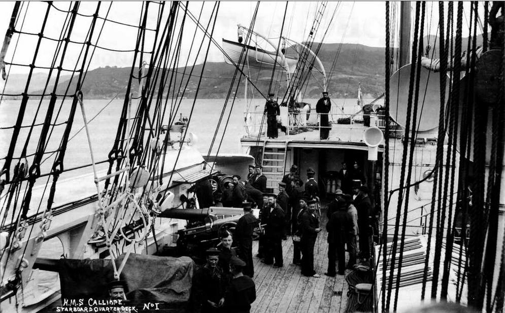 Законченный постройкой в конце 1884 г. корвет был сразу же выведен в резерв в Портсмуте и начал свою первую кампанию лишь 25 января 1887 г., отправившись на Тихий океан. Командиром корабля стал кэптен Генри Кой Кейн. Некоторое время "Каллиопа" служила на Китайской станции, но позже получила назначение на Австралийскую станцию. В конце 1887 года она прибыла в Новую Зеландию, став первым кораблем, вошедшим в новый док в Окленде, в итоге получившем название в его честь. В это время вокруг островов Самоа разгорелся дипломатический кризис, грозящий перерасти в вооруженное столкновение. После победы над Францией в войне 1870-1871 гг. Германия, объединенная под эгидой Пруссии, начала формирование собственной колониальной империи. Помимо продвижения в Африку и на острова юго-западной части Тихого океана, она направила свои корабли в Апиа, где располагалось туземное правительство Самоа, для распространения своего влияния. Это встретило энергичное противодействие со стороны Соединенных Штатов, направивших на Самоа свою Азиатскую эскадру для защиты американских интересов и наблюдения за немцами. Правительство Ее Величества, в свою очередь, в феврале 1889 г. направило туда же "Каллиопу" для защиты британских интересов. Открытая с северного направления гавань Апиа была небольшой, окруженной рифами и оборудованной крайне примитивно. Побывавший там писатель Роберт Льюис Стивенсон сравнил ее с кувшином или бутылкой с узким горлышком (ширина входного фарватера не превышала 3 кабельтовых). 14 марта 1889 г. там находилось шесть торговых судов вместимостью до 500 тонн и семь боевых кораблей трех стран: "Каллиопа", американские фрегат "Трентон" (под флагом контр-адмирала Кимберли), шлюпы "Вандалия" и "Нипсик", германские броненосный корвет "Ольга", канонерские лодки "Адлер" и "Эбер".