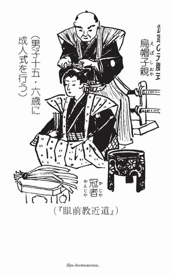 В японском восприятии младенцу требовалось некоторое время, для того чтобы превратиться в «настоящего» человека. В течение нескольких дней после рождения младенца не одевали в предназначенную для него одежду, а кутали в материнскую или отцовскую набедренную повязку или в некое подобие пеленки. Лишь после наречения имени младенца (на седьмой день после рождения) и посещения синтоистского святилища (на тридцатый день), когда ребенка предъявляли богам (часто для лучшей коммуникации с ними его вынуждали там плакать), он получал «человеческий» статус и имел право на личную одежду, которая маркировала его пол (темная или черная — для мальчиков, красная — для девочек). Затем младенца регистрировали в буддийском храме и вносили в подворные списки. Теперь он получал право на жизнь и становился «настоящим» человеком. До этого времени его право на жизнь было ограниченным — в крестьянской среде инфантицид был достаточно распространенным явлением. Перед тем как стать взрослым, ребенок проходил несколько возрастных этапов. До семи лет он вел вполне привольный образ жизни, предаваясь играм. На его поведение накладывалось крайне мало ограничений. После достижения семилетнего возраста начиналась подготовка к взрослой жизни. Среди самурайства и горожан главная цель такой подготовки заключалась в обучении церемониальности (яп. рэй), с помощью которой поддерживалась строгая социальная иерархия. Церемониальные нормы предписывали человеку «правильное» телесное и речевое поведение во взрослом обществе. Эти регламентации охватывали все стороны публичного поведения. Учебники по церемониальному поведению также подчеркивали необходимость изучения чайной церемонии — потому что все движения во время ее проведения отличаются крайней формализованностью[2]. Воспитатель должен был научить ребенка его месту в социуме, где есть отец и мать, старшие братья, сестры, дядья и тетки, старшие по возрасту, которым надлежит беспрекословно повиноваться и служить. Эти церемониально–этикетные нормы были направлены на избегание непредсказуемого поведения, закрепляли социальную иерархию («знание различий между высоким и низким и есть ритуал [церемониальность]»[3]), формулировали нормы общения и таким образом препятствовали генерированию непредсказуемых событий, то есть выступали в качестве своеобразного «замедлителя» истории. В это время поведенческий канон подростка был зафиксирован в тексте под названием «24 примера сыновней почтительности». Примеры были взяты из китайской жизни, но в то время это только добавляло им авторитетности. В частности, там повествовалось о мальчике У Мэне. Поскольку комары нещадно жалили его нищих родителей (у них в доме не было даже занавесок), он на ночь набрасывал свою одежонку на них, а сам подставлял голое тело кровососам, отвлекая их внимание от отца с матерью[4]. В другой истории фигурировал мальчик Ван Сянь. Его злой мачехе в лютую зиму захотелось отведать свеженькой рыбки. Подойдя к реке, он разделся, растопил жаром своего тела лед — из полыньи выпрыгнули две рыбины, которыми он и накормил мачеху. Переход подростка во взрослое состояние происходил в возрасте 13–15 лет. Он маркировался церемонией гэмпуку, которая происходила в синтоистском святилище. Во время этой церемонии подросток получал взрослую одежду (она 