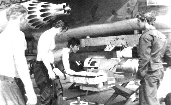 Подвеска штурмовой низковысотной авиабомбы ОФАБ-250ШН на балочный держатель БД3-УМК истребителя-бомбардировщика МиГ-27Д из состава 58-го апиб.