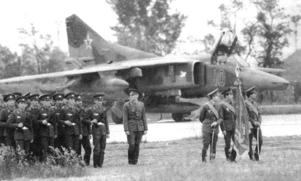 Парадный расчёт с боевым знаменем 88-го апиб на фоне МиГ-27Д в день вывода этой части из Венгрии. Дебрецен, 15 мая 1990 г.