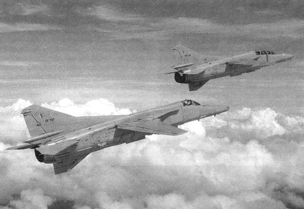 Пара МиГ-27, подготовленная для атаки воздушных целей. Каждый самолёт несёт две управляемых ракеты Р-13М1 на АПУ-13БС и подфюзеляжный бак ПТБ-800.