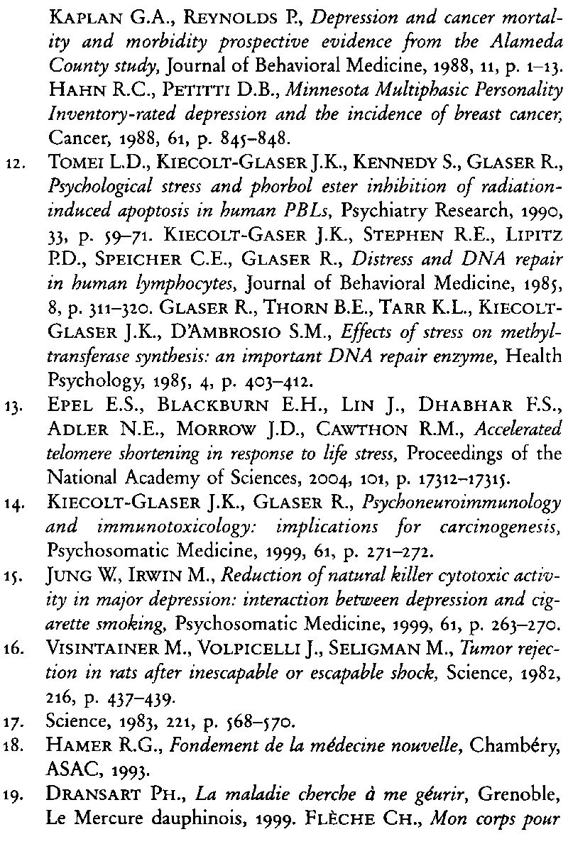 ”Я это чувствовала. С тех пор как умер мой сын, я понимала: в моем теле что-то происходит, — объясняет Кристина, врач-онколог, только что узнавшая, что у нее рак молочной железы. — У кого-то другого на моем месте выпали бы волосы, у кого-то на почве депрессии прекратились бы месячные. А я вот отрастила себе рак. Я это поняла, едва взглянув в глаза своему отражению”. В наши дни на Западе многие люди связывают свою болезнь с каким-то конкретным событием, случившимся незадолго до того, как им поставили онкологический диагноз. С учетом того, что мы знаем об экспоненциальном росте злокачественных опухолей, так быстро “отрастить” рак едва ли возможно. Тем не менее некоторые исследователи подвергают сомнению общепринятую теорию, согласно которой рак вырастает из одной аномальной клетки. По их мнению, болезнь начинается с небольшой группы клеток, которая может состоять из нескольких единиц. В таком случае не обязательно ждать восемь лет, чтобы опухоль достигла критического размера в 1 см3. Исследование, проводившееся в Австралии, показало, что 40 % женщин, заболевших раком молочной железы, убеждены, что их болезнь вызвана стрессом[7]. Потеря близкого человека, неудача в профессиональной деятельности, не находящий себе выхода гнев — в каждом случае отчетливо идентифицируются эмоциональный шок и психическое напряжение. Однако за исключением немногочисленных исследований, которые вроде бы подтверждают такую связь[8], большинство результатов опросов среди женщин, заболевших раком молочной железы, свидетельствуют скорее об обратном: со строго научной точки зрения доказательств связи между конкретной стрессовой ситуацией и раком не существует[9]. Также зачастую пациентки убеждены, что нажили рак, “грызя себя изнутри”. Кто-то жалуется на хроническую неудовлетворенность своим положением в семье, личной жизнью или работой. Другие отмечают приступы депрессии, повторяющиеся на протяжении многих лет. Иногда упадок духа относится к недавнему времени. “Уже несколько месяцев я чувствовала, что мне не хочется жить”, — констатирует Леа, молодая женщина, только что узнавшая о своем диагнозе. Рассказы такого рода, возможно, объясняют, почему еще во втором веке до нашей эры греческий врач Гален утверждал, что опухоли груди чаще встречаются у женщин, подверженных меланхолии[10]. Тем не менее и в этом случае никакие серьезные эпидемиологические исследования не подтверждают непосредственной связи между депрессией и раком[11]. Кроме того, иммунные и воспалительные реакции, спровоцированные опухолью, высвобождают вещества, воздействие которых на мозг может вызывать изменения в настроении и поведении. Так что некоторые симптомы депрессии, появившиеся незадолго до обнаружения рака, оказываются не причиной, а скорее следствием болезни. Однако вопрос о психологическом происхождении рака пока не закрыт. Тому есть причины: недавние исследования показывают, что стресс и депрессия нарушают процесс восстановления хромосом и ускоряют старение клеток[12]. Так, например, у женщин, испытывающих хронический стресс, выявлено укорочение теломер — своеобразных защитных “колпачков” на концах хромосом, сравнимое с тем, которое обычно наблюдается у людей на 10 лет старше[13]. Можно заключить, что психологические факторы приводят к накоплению ошибок и повреждений на ур