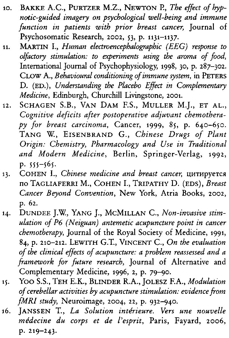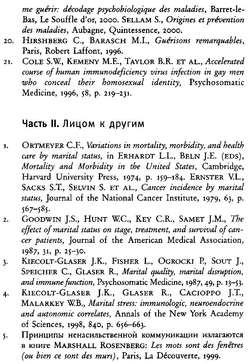 Вам действительно не повезло, — сказал Катрин ее гинеколог. — В правой груди мы обнаружили маленькую опухоль, меньше сантиметра. Она состоит из высокодифференцированных клеток, и они не распространились в подмышечные лимфоузлы. Зато слева ситуация не столь благополучна: размер опухоли три сантиметра, клетки низкодифференцированные, быстро размножаются и уже захватили два подмышечных лимфоузла. В среднем рак груди излечим в 60 % случаев, но в вашем случае прогноз, разумеется, более мрачный”. Катрин не верила своим ушам. Ей только что удалили обе молочных железы, она знала, что впереди дополнительное лечение — химиотерапия и облучение, и при всем при этом у гинеколога не нашлось для нее других слов, кроме как “прогноз более мрачный”. В обычной ситуации такое катастрофическое известие повергло бы ее в шок. Но на этот раз речь шла о ее жизни. “Я вовсе не собиралась позволить им свести меня к какой-то статистике, — вспоминает она. — То, что мой врач сказал “разумеется”, было уже слишком. Даже если бы у меня был лишь один шанс на выздоровление из ста, я желала верить, что мне повезет! Почему надо было объявлять мне правду, делая упор на ее негативные аспекты? Мой гинеколог явно не считал, что стакан наполовину полон — ему было куда важнее, что тот наполовину пуст. Каждый может смотреть на жизнь по-своему. Но там, где дело касается меня, я не могу жить без надежды”. Катрин права: надежда побуждает нас жить. Многочисленные исследования показывают, что, представляя благоприятное завершение своих нынешних трудностей, мы испытываем положительные эмоции и, как следствие, мобилизуем механизмы иммунной защиты и восстановления организма[1]. “Я уверена: то, что я верю в Бога, помогло мне выздороветь, — заявляет Элизабет. — И как мой врач ни пытался меня переубедить, я не позволила ему лишить меня той поддержки, которую дарует вера. В медицине тоже есть свои поверья. Я отношусь к ним с уважением и признаю их полезность. Так что, по-моему, врачам следует уважать религиозные чувства своих пациентов и принимать в расчет пользу, которую они способны принести!” К сожалению, многие врачи совершенно игнорируют воздействие мысли на организм пациента. Стоит заговорить с ними на эту тему, как они сразу настораживаются, заводят речь об эффекте йлацебо, предрассудках и внушаемости. Но знают ли они, что эффект плацебо — вовсе не сюжет для анекдотов, что он оказывает влияние на эффективность большинства методов лечения[2]? Так, многочисленные исследования показывают, что просто вера в полезность лекарства вызывает изменения в деятельности мозга и тем самым запускает целый ряд неврологических, гормональных и иммунных реакций, тем или иным способом благотворно влияющих на здоровье[3]. Результаты этих работ имеют первостепенное значение, поскольку они позволяют наглядно продемонстрировать ту важнейшую связь, которая существует между мыслью, эмоциями и благополучным функционированием организма. “Вместо того чтобы объявлять эффект плацебо незначительным и противоречащим всякой логике, моим коллегам следовало бы использовать его для повышения эффективности терапии, — говорит Кристина, врач-онколог. — Ведь многие врачи, стремясь воздействовать на ход болезни, забывают о том, что пациенты сами способны помочь своему выздоровлению, и этой способностью не сто