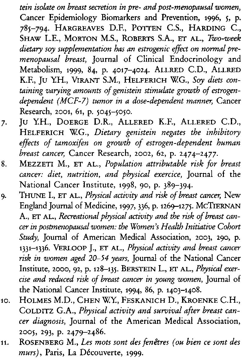 ”Я хочу вести такой образ жизни, который позволит мне избежать рецидива болезни”, — заявляет Валери. Это главная забота всех женщин, которые лечились от рака груди. Однако, как мы видели в начале этой книги, рак — болезнь, имеющая многофакторное происхождение. К нарушению равновесия, провоцирующему возникновение болезни, приводит совокупность целого ряда причин. Некоторые из этих причин — например, генетическая предрасположенность или факторы окружающей среды — неподвластны нашему контролю. Зато на других уровнях мы можем вмешаться. “Как правило, следует избегать повышения уровня эстрогенов”, — объясняет Кристина, врач-онколог. Это значит отказаться от противозачаточных таблеток или заместительной гормональной терапии после менопаузы. А еще покончить с питанием, чрезмерно богатым жирами, — известно, что жиры повышают уровень эстрогенов в крови. Напротив, потребление полиненасыщенной жирной кислоты омега-3 или альфа-линоленовой кислоты в сочетании с витамином Е оказывает защитный эффект. В последние годы проводилось множество исследований на тему влияния рациона питания на рак груди и предлагалось немало различных диет. Многие из этих рекомендаций, увы, противоречат друг другу. “Однако это не повод отрицать роль питания в появлении рецидивов рака, — замечает Кристина. — Очевидно, что надо соблюдать некоторые принципы, основанные на здравом смысле”. Так, можно посоветовать здоровое сбалансированное питание на основе свежих фруктов и овощей: в частности, полезны крестоцветные — брокколи, белокочанная, краснокочанная и брюссельская капуста, а чеснок, шпинат и щавель считаются особенно эффективными для профилактики рака. Необходимы злаки, выращенные без применения химических удобрений и пестицидов, а вот потребление животных жиров лучше немного сократить: белое мясо, птица и рыба предпочтительнее красного мяса. Приготовление на пару позволяет сохранить витамины, а готовить при умеренной температуре (90-100 °C) или на водяной бане лучше, чем на сильном огне или в кипящем бульоне. Кроме того, защитное действие изофлавонов (фитоэстрогенов), содержащихся в сое, в настоящее время все более оспаривается. По данным многочисленных исследований, потребление сои в больших количествах значительно снижает риск рака груди[5]. Однако наблюдения на мышах показали, что рацион, богатый соей, стимулирует рост гормонозависимых опухолей, а два недавних исследования указывают на то, что повышенное потребление сои может вызвать эстрогенную стимуляцию молочных желез у женщин в период до наступления менопаузы[6]. Кроме того, похоже, что содержащиеся в сое изофлавоны могут препятствовать ингибирующему действию тамоксифена, назначаемого для предупреждения рецидивов[7]. “Так что здесь нужна осторожность, — заключает Кристина, которую особенно интересуют эти вопросы. — На сегодня женщинам, переболевшим раком молочной железы, следует отказаться от повышенного потребления сои. Особенно если анализ их опухоли выявил наличие рецепторов эстрогенов”. “Помимо правильного питания необходимы физические упражнения”, — настаивает Клер, врач-радиотерапевт. Давно известно, что сидячий образ жизни — один из факторов, способствующих появлению рака груди[8]. Многие исследования показали, что регулярная физическая активность снижает риск появ