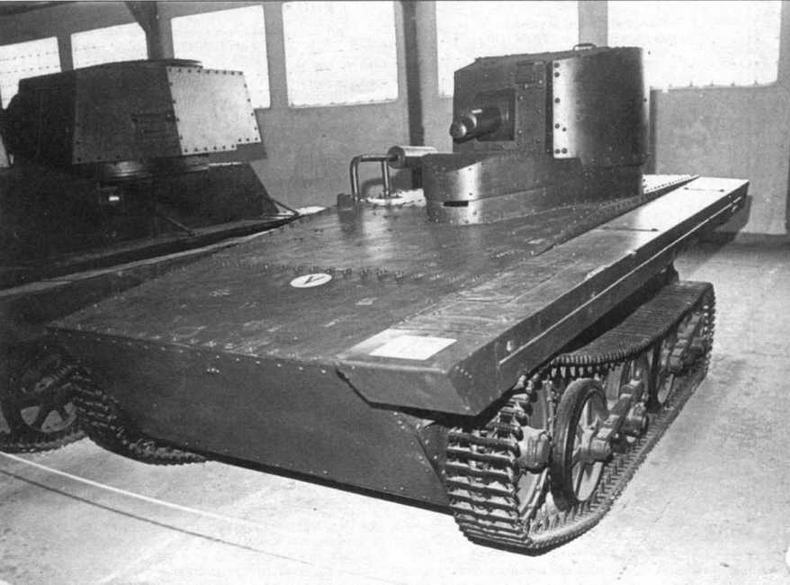 Уже к августу в ОКМО завода «Большевик» в Ленинграде под руководством Н.В.Барыкова был создан плавающий танк Т-33, а на заводе № 37, тогда еще в подмосковном Черкизове, под руководством Н.Н.Козырева изготовили танк Т-41. Осенью прошли их сравнительные испытания. Плавающий танк Т-33 мало чем отличался от английского прототипа. Его корпус имел корытообразную форму и клепаную конструкцию. Во вращающейся башне, смещенной к левому борту и к корме, находился пулемет ДТ с боекомплектом 2140 патронов. Перед башней устанавливался волноотражательный щиток со смотровой щелью. Башня поворачивалась вручную, при помощи рукояток, приваренных изнутри. Двигатель «Форд-АА» мощностью 40 л.с. размещался вдоль правого борта; трансмиссия, включавшая в себя сцепление автомобильного типа, коробку передач и главную передачу с простым дифференциалом и колодочными тормозами, — в передней части машины. Конструкция ходовой части практически полностью была заимствована у танка Vickers Karden-Loyd. Движение на плаву обеспечивали трехлопастный гребной винт и установленный в его струе руль большой площади. Плавучесть танка повышалась за счет двух поплавков, крепившихся к надгусеничным полкам. Правда, они были изготовлены уже не из дорогостоящей бальзы, а заполнялись пробкой или сушеными водорослями. При массе в 3 т танк развивал скорость на суше 45 км/ч, на плаву — 5 км/ч. Плавающий танк Т-41 разработали в двух вариантах. Первый образец обладал большим запасом плавучести, но --">