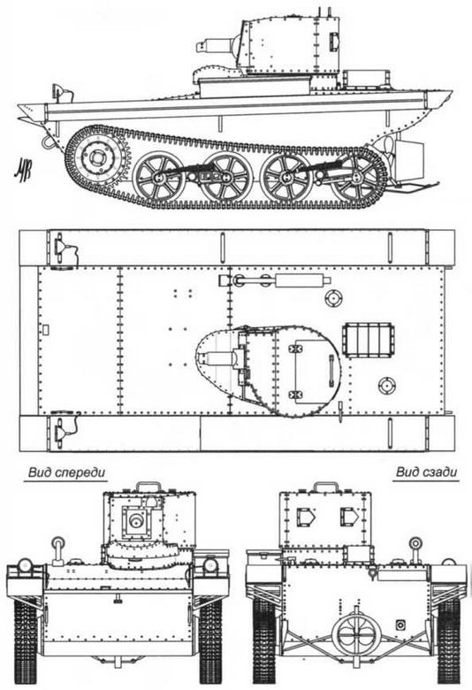 Первый в мире по-настоящему надежный плавающий танк разработала и построила английская фирма Vickers Armstrong. Его прототип был изготовлен в течение апреля 1931 года на экспериментальной станции фирмы в Чертей и проходил испытания на р.Темзе. Плавучесть танка обеспечивалась малой массой, корытообразной формой клепаного корпуса и поплавками из бальзы, укрепленными над гусеницами. Кроме того, прототип имел поплавок из капка, укрепленный поперек кормовой части корпуса. Башня вместе с пулеметом была заимствована у 6-тонного танка Vickers Mod.А. Лобовая 9-мм броня защищала машину от бронебойных пуль на дистанциях свыше 150 м, а 7-мм бортовая— на дистанциях свыше 250 м. Танк имел блокированную подвеску. На каждом борту располагались по две двухкатковых балансирных тележки, подвешенные на четвертьэллиптических листовых рессорах. Последние опорные катки задних тележек выполняли роль направляющих колес. Ширина мелкозвенчатых гусениц — 257 мм. Карбюраторный 6-цилиндровый двигатель Meadows EST мощностью 90 л.с. позволял машине массой 2,75 т развивать скорость на суше до 64 км/ч, а на плаву— 9,7 км/ч. Двигатель, трансмиссия, включавшая в себя четырехскоростную коробку передач 9AU, и радиатор размещались справа, а башня и рубка механика-водителя были смещены влево. Движение на плаву осуществлялось с помощью гребного винта. Маневрирование — с помощью кольцевого руля, управляемого с места механика-водителя. По результатам испытаний поплавок из капка сняли, а крышу кормовой части корпуса сильно вытянули назад. Тем не менее, из-за смещенного центра тяжести корма танка на плаву глубоко погружалась в воду. В июне 1931 года испытания были завершены, и всю документацию передали на завод фирмы Vickers в Эльсвике, где в дальнейшем боевая машина, получившая название Vickers Carden-Loyd и индекс военного министерства А.4, производилась серийно. Впрочем, британская армия в августе того же года заказала только два танка, которые прошли обширную программу войсковых испытаний. Также по две машины были изготовлены для Сиама и Нидерландов. Наиболее крупную партию плавающих танков — 29 единиц — закупил Китай; они вошли в состав 1-го и 2-го танковых батальонов Китайской национальной армии, участвовали в 1937 году в уличных боях с японцами в Шанхае и тогда же почти все были потеряны. 5 февраля 1932 года советская внешнеторговая фирма АРКОС (Arcos Ltd. — All Russian Cooperative Society Limited) заказала фирме Vickers восемь плавающих танков. Первая машина была поставлена 21 июня, а последняя — 22 октября того же года. После поступления первых закупленных танков, их испытаний и всестороннего изучения началось интенсивное проектирование отечественных образцов. При этом никакой лицензии не приобреталось.