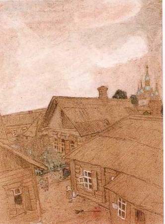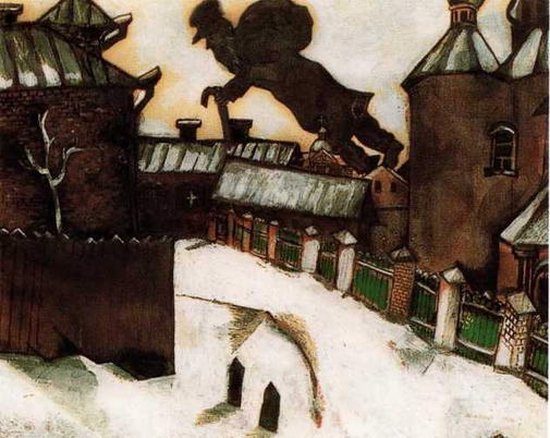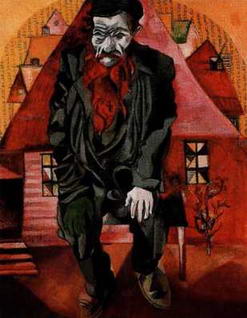 Однажды ранним утром, еще до зари, под нашими окнами раздались крики. При слабом свете фонаря я еле разглядел бегущую по пустым улицам женщину. Она размахивала руками, рыдала, заклинала, чтобы кто-нибудь - а все еще спали - спас ее мужа <."> и бежала дальше. <".> Каждый что-то говорил, советовал, кто- то растирал больному руки и натужно дышащую грудь. Камфарой, спиртом, уксусом. Поднялся стон и плач. Но самые умудренные, все повидавшие старики выводят женщин, не спеша зажигают свечи и в наступившей тишине принимаются громко читать молитвы у изголовья умирающего". Этот эпизод детства, рассказанный художником в автобиографии, в 1908 году превратился в сурово-романтическую картину. Шагал осуществил операцию по преображению действительности. Здесь едва ли не впервые появляется навязчивый образ шагаловских фантазий - скрипач, играющий на крыше. Траурная атмосфера В автобиографии Шагал описывает также атмосферу скорби и молитвенный дух, воцарившиеся в родном местечке: "Весь день дети жалобно и нараспев будут читать "Песнь Песней". А покойный, с величаво-скорбным лицом, освещенный шестью свечами, уже лежит на полу". Скорбные мазки Картина "Покойник", как и другие юношеские работы Шагала, заставляет зрителя внезапно почувствовать свою причастность фантазии, принимающей сказочные формы. Горе передано здесь через ряд жестов, причем самые трагические из них почти смыкаются с комическими. Повторяющиеся мотивы В картинах Шагала раннего периода улица приобретает значение центрального элемента композиции. Это справедливо и для этюда "Над Витебском" (1914), приведенного ниже. Над улицей плывет фигура Вечного Жида — повторяющийся мотив в искусстве Шагала.