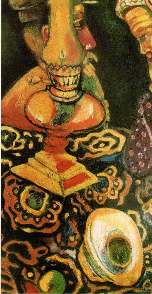 "Очутившись в Париже, - пишет Шагал в автобиографии, - я, конечно же, пошел на спектакль дягилевской труппы, проведать Бакста и Нижинского. <...> Все его (Русского Балета) открытия, находки, новшества подбирались и отшлифовывались в угоду светскому вкусу: изящно и пикантно.А я - сын рабочего, и меня часто подмывает наследить на сияющем паркете". "Натюрморт с лампадой" (1910) явно навеян воспоминанием о теплом домашнем уюте витебского интерьера.