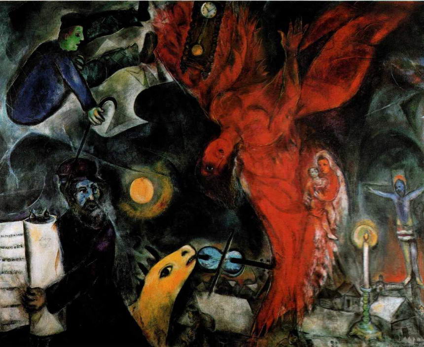 Шагал вырос в бедной еврейской семье и никогда не допускал, чтобы глубокая духовность, воспринятая им в детстве, стала пустым звуком или превратилась в догматическое соблюдение предписаний Талмуда. Религиозные струны его души заставляли думать и верить, что Бог возвещает о себе в слове и являет себя в жизни. В юношеских работах Шагала ощущается постоянный поиск откровения: жизнь и религия все время переплетаются, пытаясь найти объяснение друг другу. Он пишет бракосочетания, праздники, богослужения, похороны.