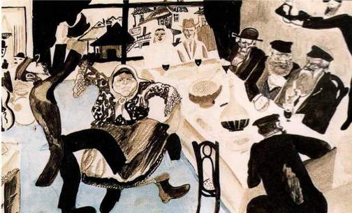 "Еврейская свадьба" (после 1910). Сцены повседневной жизни доказывают, сколь последовательно Шагал избегал академизма: в его глазах "Сезанн, Мане, Моне, Матисс и другие это всего лишь законодатели мод".