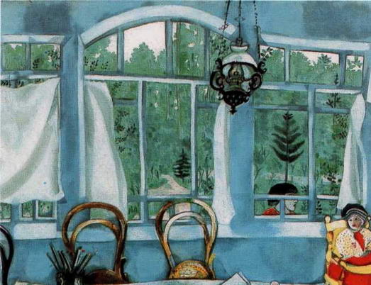 Справа - "Вид из окна" (1915); внизу - "Окно с видом в сад" (1917, Санкт-Петербург, Музей Бродского). Сравнение двух картин показывает, как далеко ушел Шагал от беспокойного прошлого. Будущая жизнь сулит ему безмятежность и гармонию, выраженные в пейзаже.