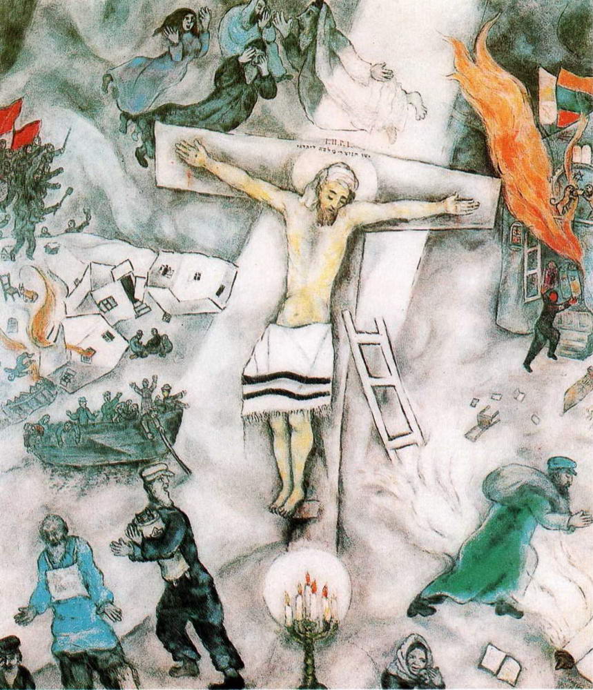 Распятие, кульминационный момент в драме христианского мировосприятия, было для Шагала мотивом, позволяющим с наибольшей остротой выразить боль за судьбы человечества. Еще не началась Вторая мировая война, но художник чувствовал неминуемое приближение трагедии. Война поразит всех и вся: она коснется и ребенка, которого пытается защитить мать; и дома, символизирующего труд и семейный уют; и свитков Закона в руках у старика; и мешка на плечах все того же Вечного Жида. Огромный, окруженный божественным сиянием Христос соединил саму смерть с идеей блаженства. Вместо набедренной повязки у него ритуальное покрывало для молитв. У основания креста - иудейский семисвечник. Как и написанная годом раньше "Революция", это большое, программное живописное произведение торжественно и недвусмысленно выражает мысль художника. Шагал, не стыдясь, раскрывает себя в своем творении: для него важнее всего возвращение к гуманистической и христианской идее в искусстве - единственному пути спасения от варварства.
