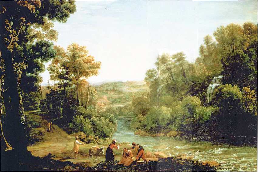 Знаменитый французский живописец и гравер Клод Лоррен родился в Лотарингии в крестьянской семье. Мальчик рано остался сиротой, что определило его скитания в юности по Европе. Первые уроки рисования Клоду преподал его старший брат, который был искусным гравером. В 1613 Лоррен уехал с родственником в Италию, где стал слугой в доме живописца Агостино Тасси. Наблюдая за работой своего хозяина, он осваивал ремесло художника, позднее, в 1627–1629, продолжил свое обучение в Неаполе у архитектора Готфрида Вельса. Затем Лоррен перебрался в Рим, где с небольшим перерывом прожил всю оставшуюся жизнь. В начале своей карьеры самостоятельного живописца он выполнял заказные декоративные работы, так называемые пейзажные фрески, но позже ему удалось стать профессиональным «пейзажистом» и сосредоточиться на станковых работах. Он был одним из первых живописцев, попытавшихся передать игру солнечного света. Работы мастера оказали влияние на развитие европейского пейзажа, в частности на У. Тернера. Интересно, что фигуры, которые оживляли полотна художника, как правило, рисовали его друзья (Ф. Лаури, Я. Миль, Фр. Аллегри и другие). На представленной картине изображен идеальный лесной пейзаж с горным ручьем. В центре композиции помещена сидящая дама, которую утешают мужчина и женщина. Слева к ним подходит юноша с осликом.