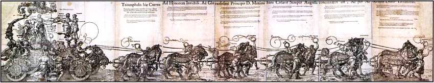 Альбрехт Дюрер — один из величайших художников западноевропейского искусства Ренессанса. В 15 лет он поступил в мастерскую к ведущему нюрнбергскому творцу того времени Михаэлю Вольгемуту, где прекрасно освоил не только живопись, но и гравирование. В 1495 в городе Дюрер открыл свою гравюрную мастерскую, в которой и была создана большая часть его знаменитых работ. Историки искусства высказывают предположение, что он был первым, кто начал делать гравюры специально на продажу. Их реализацией занимались жена и мать мастера на ярмарках в Нюрнберге, Аугсбурге и Франкфурте-на-Майне. Он считал, что именно этот вид изобразительного творчества сможет принести ему материальное благополучие. С 1512 покровителем Дюрера становится император Священной Римской империи Максимилиан Габсбург (1486–1519). По словам современников, Максимилиан был красивым, храбрым человеком с живым умом, умел красноречиво говорить. Его по праву считали одним из последних рыцарей Европы. По заказу правителя Дюрер и его ученики сделали гигантскую ксилографию — «Триумфальная арка» размером 3,57x2,95 м. Она была составлена из 192 листов и предназначалась для украшения стены. В дополнение к «Триумфальной арке» Маркс Трейтцзаурвейн разработал проект гравюры «Триумфальная процессия», ксилографию которой выполнили Дюрер, Альбрехт Альтдорфер и Ганс Шпрингинклее. На ксилографии изображен императорский кортеж — карета, запряженная шестью парами коней, в сопровождении свиты. В ней восседает правитель в короне Священной Римской империи с пальмовой ветвью и скипетром в руках. Его окружают женщины с венками, символизирующие человеческие качества, достойные властителя (Согласие, Постоянство и так далее). Над головой императора солнце держит герб Габсбургов — в геральдическом щите двуглавый орел. Женщина-возница, символизирующая Рассудок, управляет каретой при помощи вожжей, одна означает Благородство, а другая — Власть. С ксилографии было сделано несколько сотен оттисков, они предназначались для украшения стен дворцов и общественных зданий. Некоторые исследователи полагают, что они являлись первыми бумажными обоями.