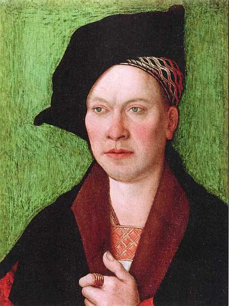 Немецкий художник Бернхард Штригель — сын известного скульптора Иво Штригеля (1430–1516). Возможно, он учился у Бартоломеуса Цайтблома (1455–1520) — выдающегося мастера алтарной живописи. Штригель является характерным представителем Северного Возрождения, в творчестве которого прослеживается генетическая связь с искусством поздней готики. Художник был придворным живописцем императора Священной Римской империи Максимилиана из рода Габсбургов (1486–1519). Правитель прославился как покровитель искусства, человек, в котором современники видели «последнего рыцаря». На портрете изображен молодой человек в традиционном швабском головном уборе. Судя по костюму, перед зрителем представитель знатного рода (верхний край рубахи украшен орнаментом, расшитым золотой нитью). Видно, что он тщательно следит за собой — волосы покрыты специальной сеточкой, лицо гладко выбрито. Левая рука героя прижата к груди. Художник с большим мастерством выписал пальцы модели, показывая на указательном многорядное кольцо. Считается, что носимое на этом пальце украшение помогает преодолевать неуверенность в себе и способствует повышению самооценки. Этот штрих так же, как и руки, сложенные на груди, точно передает психологическое состояние портретируемого.