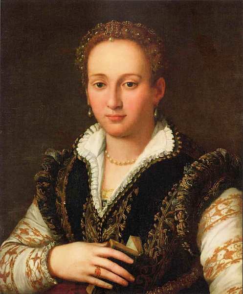 Данный портрет относят к мастерской известного флорентийского живописца Алессандро Аллори — одного из лучших представителей итальянского маньеризма. Рано лишившись отца, Аллори был практически усыновлен Аньоло Бронзино, другом семьи и придворным художником тосканских герцогов Медичи. Со временем молодой человек стал его любимым учеником, называл опекуна своим дядей и после кончины Бронзино в 1572 закончил его последнюю фреску в палаццо Веккьо. Аллори прославился не только как живописец, но и как талантливый педагог, создавший свою школу. У него учились Джованни Буттери, Кристофоро дель Альтиссимо, Джованни Биццели, Чезаре Дандини, Аурелио Ломи, Джона Моснира и многие другие. Данный портрет изображает Бьянку Капелло, которая была второй женой великого герцога Тосканского Франческо Медичи. Эта женщина вошла в историю благодаря своему супругу. 17 октября 1587 в возрасте 46 лет он после непродолжительной болезни неожиданно умер, а через несколько часов скончалась и Бьянка. В наши дни исследователи убеждены, что причиной скоропостижной смерти пары была не малярия, как писали современники, а яд. Считается, что чету отравил брат герцога — кардинал Фердинандо. На портрете запечатлена молодая красивая женщина с молитвенником в руках, говорящим о ее набожности.