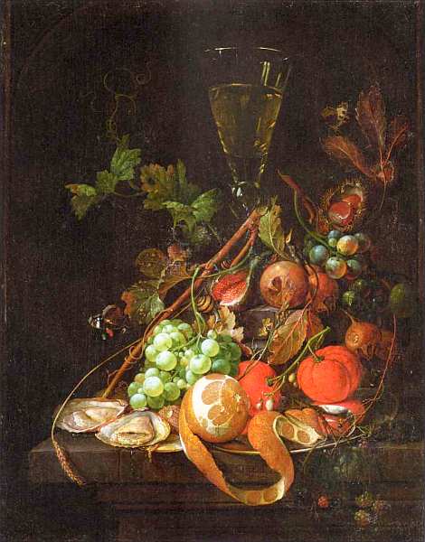 Корнелис де Хем — художник в третьем поколении, яркий представитель голландской живописи. Он родился в Лейдене, учился мастерству у своего отца Жан Давида де Хема и вслед за ним прославился натюрмортами. Де Хем работал в Гааге и Антверпене, он мастерски использовал возможности цвета и добивался высокой степени прозрачности красок, его изображения неодушевленной природы отличаются реалистичностью. Натюрморт был одним из излюбленных жанров у формирующегося класса пуританской торговой верхушки Нидерландов. Изображения различных плодов и фруктов, объектов неживой природы имели глубокий смысл для современников художника, олицетворяя, с одной стороны, красоту мира, а с другой — его бренность и суетность. На данной картине устрицы указывают на близость к морю, виноград и вино в стеклянном фужере на длинной ножке, как и лоза, символизируют изобилие, богатство, а лимон со срезанной кожурой напоминает о том, что не все в этом мире так сладостно, как кажется. Подобные натюрморты нередко назывались «vanitas vanitatum» («суета сует») или «memento mori» («помни о смерти»).