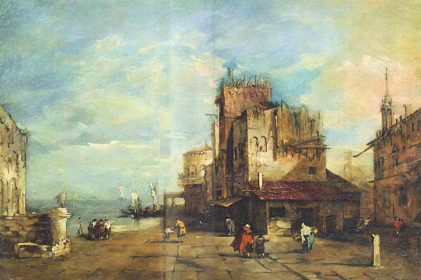 Итальянский живописец, видный представитель школы ведутистов, Франческо Гварди рано лишился отца. В выборе будущей профессии большое влияние на него оказали старшие братья, которые являлись художниками, кроме того, сестра Гварди была замужем за известным венецианским живописцем Джованни Батисто Тьеполо. Еще в юности Франческо начал писать городские пейзажи, войдя в группу ведутистов. Этот жанр был необыкновенно популярен в XVIII веке. При жизни Гварди находился в тени своих более знаменитых коллег-современников, в первую очередь Антонио Каналетто. Однако мастер был художником, писавшим не только городские виды, но и фигурные станковые картины, в которых он достиг значительных успехов. Гварди считается одним из последних представителей классической венецианской школы живописи. На этом полотне художник изобразил портовую площадь в маленьком итальянском городке. В отличие от большинства ведутистов Гварди не стал детально прописывать итальянскую архитектуру — обветшалое барокко, ставшее одним из символов романтизма в европейской живописи. В его письме чувствуется эскизность, которая предает полотну жизненность. По достоинству его творчество было оценено только в конце XIX века импрессионистами.