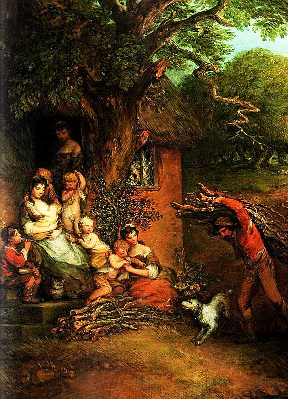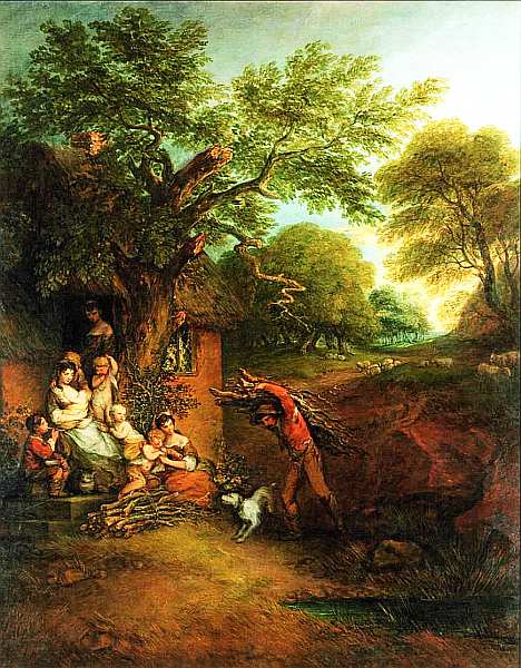 Томас Гейнсборо — английский живописец и график эпохи сентиментализма. Он начал рисовать пейзажи еще ребенком, в 1740-х уехал в Лондон, где учился у известного французского графика Юбера Гравло, иллюстрировавшего издания Ж.-Ж. Руссо и других популярных авторов своего времени. В 1745 Гейнсборо открыл студию в Лондоне. В дальнейшем он переезжал из одного города Англии в другой, выполняя заказы богатых клиентов. В 1774 уже признанным художником Гейнсборо возвратился в Лондон, где прожил до самой смерти. Среди его многочисленных заказчиков были первые лица английской аристократии, считалось престижным иметь портрет, написанный им. Наряду с портретом как жанром большое внимание живописец уделял пейзажу. Тонкий колорист, Гейнсборо умело соединял в своих портретах реализм и сентиментально-романтическое настроение, которое создавал при помощи фона или пейзажа. В его пейзажах особенно ярко воплотился идеал сентиментализма, «когда мирное странствие сердца в поисках за природою и за всеми душевными влечениями, способными внушить нам больше любви к ближним и ко всему миру, чем мы обыкновенно чувствуем» (Лоренс Стерн «Сентиментальное путешествие», 1768). Данная картина может служить идеальным примером сентиментализма. Маленький бедный домик в лесу, в котором проживает большая и дружная семья. Женщины и дети сидят на ступеньках, встречая отца семейства, возвращающегося из леса с дровами. Сопровождающая его собака радостно скачет вокруг ног хозяина.