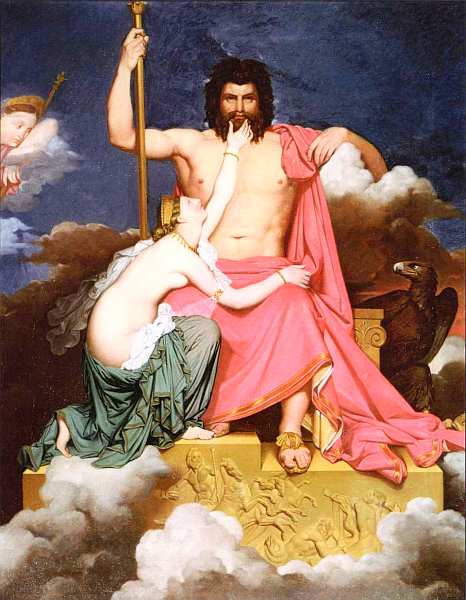 Жан Огюст Доминик Энгр — французский художник неоклассического направления. Начав свое обучение в тулузской Академии живописи, после ее окончания он переехал в Париж. Здесь в 1797 Энгр стал учеником Жака-Луи Давида. Первый успех пришел к нему в 1801, когда была присуждена Большая римская премия. Прославившись портретами и обнаженной натурой (знаменитые одалиски), Энгр немало внимания уделял мифологической тематике. На данной картине изображен Юпитер, его колено обнимает нимфа Фетида. Воспитанница Геры, она стала объектом страсти громовержца. Его от обладания ею остановило предсказание, согласно которому ребенок от этой связи стал бы могущественнее отца. Юпитер, восседающий на троне рядом с орлом, своим посланником, производит впечатление не страстного влюбленного, а застывшей скульптуры, в то время как Фетида изображена в позе преклонения перед своим повелителем. Судя по композиции, бог уже узнал о предсказании. На заднем плане виднеется голова Геры, наблюдающей за происходящим.