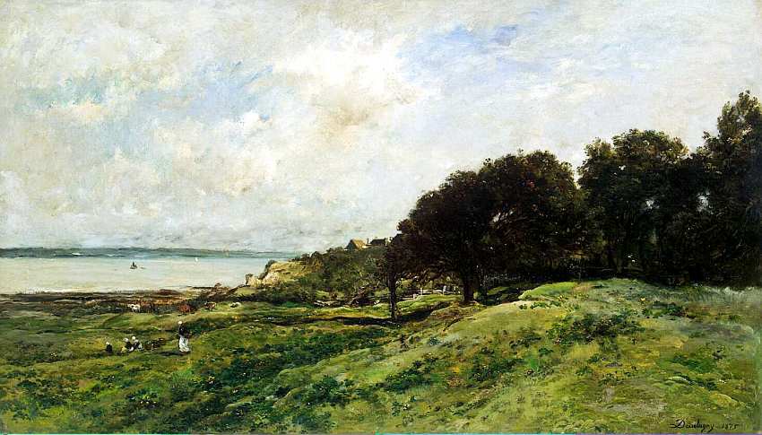 Шарль Франсуа Добиньи — французский живописец, участник барбизонской школы. Его первыми учителями рисования были отец Э. Ф. Добиньи — художник миниатюрист, а также знаменитый академист П. Деларош. Уже с?838 Добиньи принимал участие в выставках, представляя классические пейзажи, однако признание к нему пришло только в начале 1850-х, когда живописец познакомился с участниками барбизонской школы. В отличие от других участников группы Добиньи стремился освободить пейзаж от романтической символики и отображать природу максимально достоверно. По его мнению, личное восприятие не должно участвовать в отражении того, что увидел художник. Добиньи пытался в своих полотнах передать непосредственность работы на пленэре. Именно эта эскизность в его пейзажах вызывала как похвалу, так и осуждение критики. Считается, что техника письма Добиньи (резкие мазки кисти, объемное нанесение красок) в последующем оказала влияние на формирование живописной манеры импрессионистов. Несмотря на некоторые разногласия, он поддерживал дружеские отношения с другими участниками барбизонской школы — Теодором Руссо, Жюлем Дюпре, Нарсисом Вержиль Диаз де ла Пенья. На картине изображено побережье на севере Франции в местечке Виллервилль. Зеленая трава и деревья переходят в серо-голубое небо, практически смыкающееся с морем. Несколько человеческих фигур, направляющихся к морю, оживляют пейзаж. Виллервилль и его окрестности не раз становились натурой для художника.