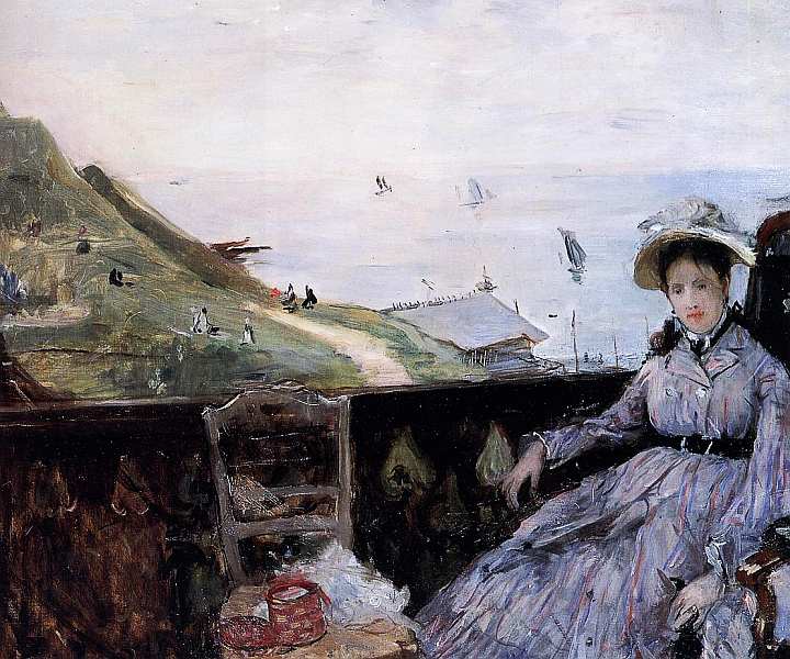 Берта Моризо — французская художница, входившая в группу импрессионистов. Она происходила из обеспеченной семьи, состоявшей в родстве со знаменитым художником эпохи рококо Ж. О. Фрагонаром. В юности, увлекшись вместе с сестрой живописью, Моризо брала уроки у Камиля Коро. В 1864 она впервые выставила два своих пейзажа на парижском Салоне. Ее работы отбирались для участия в шести Салонах подряд. Между тем среди друзей художницы были мастера, чьи работы не принимались к экспонированию (К. Моне, К. Писсарро, О. Ренуар, А. Сислей). В творчестве Моризо очень заметно их влияние. Когда в 1874 «непризнанные» решили провести свою выставку в галерее Нодара на бульваре Капуцинок, художница примкнула к друзьям, дав свои полотна. На картине изображена молодая женщина, сидящая в кресле на террасе, выходящей на морское побережье. Она одета в светлое прогулочное платье, перехваченное на талии черным поясом. На голове модная шляпка, без которой была немыслима светская женщина в конце XIX века. Фоном сидящей является сероголубое море с несколькими яхтами, переходящее в такого же цвета небо. Картина «На террасе» — типичный импрессионистический пейзаж, где персонаж становится частью среды, передающей воздух и свет.