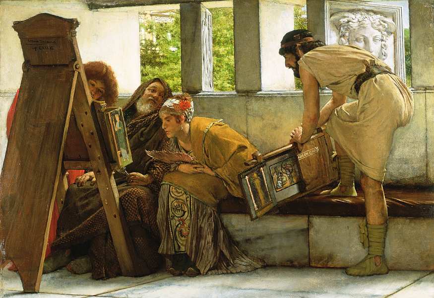 Лоуренс Альма-Тадема — известный британский живописец XIX — начала XX века, академист. Он родился в многодетной семье деревенского нотариуса в Дронрейпе (Северные Нидерланды), с детства проявлял склонность к рисованию и поступил в Академию художеств в Антверпене в класс Хендрика Лейса — одного из лидеров бельгийского романтизма. Большое значение для творчества Альма-Тадемы имела поездка в Италию в?863, после которой основной темой его полотен стали сюжеты античной истории. В целях достоверности изображенного живописец активно посещал музеи и памятники (Помпеи и Геркуланум) и даже участвовал в археологических раскопках. В 1870 он переехал в Лондон, работал как театральный художник, оформляя спектакли Джона Генри Ирвинга и Герберта Бирбома Три. Однако наибольшую известность ему принесли античные сюжеты, в основном из истории Римской империи. Общество времени расцвета викторианской Англии находило много параллелей в римской истории, поэтому картины Альма-Тадемы, выполненные в лучших традициях академизма, были необыкновенно популярны среди аристократии. За свое творчество живописец получил рыцарское звание. На картине воплощен придуманный сюжет из римской истории, показывающий художника, сидящего перед мольбертом на крытой галерее. Пожилой бородатый человек демонстрирует свое произведение двум женщинам, которые с интересом рассматривают невидимое нам изображение. Рядом с ними стоит, склонившись, молодой художник, держащий в руках мольберт. Судя по лицам, диалог на картине ведут живописцы — старший обращается к младшему, а младший что-то с готовностью отвечает.