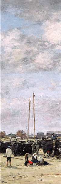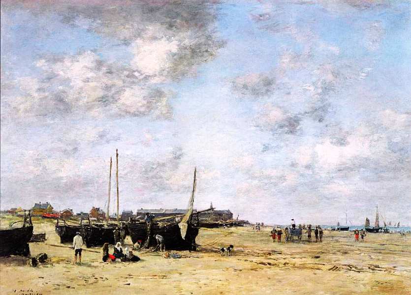 Французский художник второй половины XIX века Эжен Буден родился в Онфлере — небольшом портовом городке в Нормандии. С севером Франции была связана вся его жизнь. Буден учился живописи в Гавре, затем короткое время в Париже у известного художника Жана-Батиста Изабе, однако закончить свое образование ему не удалось. Живописец знал Ж. Ф. Милле и других мастеров-современников. В Голландии Буден познакомился с художником Яном Бартольдом Йонгкиндом, манера письма которого оказала на него огромное влияние. Именно у Йонгкинда он заимствовал светлую палитру и передачу света посредством крупных мазков. Ранние работы Будена представляют собой яркие сцены курортной жизни, исполненные в импрессионистической манере. Более поздние произведения — в основном морские пейзажи и виды побережья, на которых люди играют второстепенную роль. Мастер был одним из первых учителей Клода Моне. Хотя он не считал себя импрессионистом, но принял участие в выставке «непризнанных», проходившей в Париже в 1874. На картине изображено морское побережье Берка — самого южного французского городка в проливе Паде-Кале. Художник запечатлел отлив, во время которого рыбацкие шхуны обычно оказывались на берегу. В это время побережье становилось местом сбора не только рыбаков, чинивших свои лодки, но и романтических прогулок горожан. Признание к Будену пришло в конце жизни. В 1982 он был награжден орденом Почетного легиона. Творчество живописца непосредственно связывает его учителей барбизонцев с последователями художника — импрессионистами.