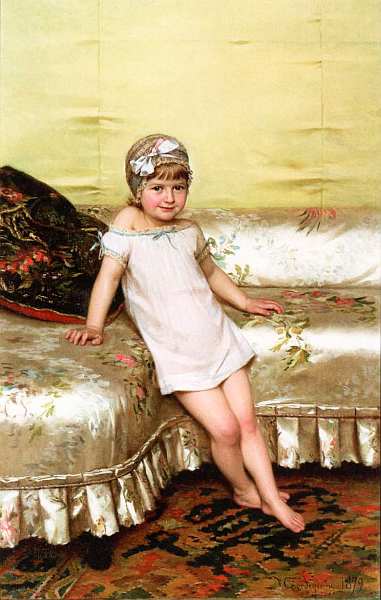 Мишель Джорджиани — итальянский художник-реалист второй половины XIX — начала XX века. Он родился во Флоренции в семье музыкантов. Этот город сам по себе является сосредоточением первоклассных произведений архитектуры и живописи, что, как и семейная среда, способствовало формированию будущего мастера. Вместе с тем Италия XIX века была поглощена политическими перипетиями и не отличалась развитием изобразительного искусства. Академизм, господствовавший повсеместно, представлял собой продукт, основанный на выхолощенном Позднем Возрождении, но именно он служил образцом для подражания целому ряду европейских художественных школ. Этот парадокс между бывшим величием и закостенелым настоящим во многом отразился в живописи Джорджиани. Джорджиани прославился портретами, в которых пытался уйти от академической статичности и придать изображаемому определенную жизненность. Картина «Шелковый диван» демонстрирует мастерство художника не столько в портрете маленькой девочки, сколько в изображении белой тканевой драпировки мягкой мебели.