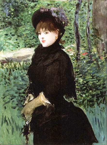 Жизнь и творчество Эдуарда Мане, одного из родоначальников импрессионизма, являют собой глубокое противоречие между бунтарскими взглядами на искусство и неистребимым желанием официального признания. Сломив сопротивление отца, в 1850 Мане поступил в мастерскую художника Тома Кутюра. Вскоре он начал выступать против классико-романтической традиции живописи, господствовавшей в то время, и искать свой стиль. В 1856-1858 подающий надежды живописец начал приобретать известность. В это время большое влияние на формирование его техники оказали работы Франса Халса, писавшего резкими мазками и любившего контраст ярких красок и черного цвета. В 1863 Мане участвовал на знаменитом Салоне «отверженных» с картиной «Завтрак на траве» (1863, музей Орсе, Париж), которая была крайне отрицательно встречена художественной критикой. Однако пик конфронтации мастера с публикой приходится на 1865, когда он показал картину «Олимпия» (1863, музей Орсе, Париж), признанную современниками непристойной и вульгарной. Однако желание достичь официального успеха побудило его отказаться от дальнейшего сотрудничества с импрессионистами. Несмотря на огромные старания, лишь в 1879 участие художника на Салоне было отмечено громким успехом. Картина «Прогулка» представляет характерный пример импрессионистической техники в сочетании с твердым рисунком, присущим Мане. На картине изображена молодая женщина в черном платье и шляпке такого же цвета. Ее одеяние можно было бы принять за траурный наряд, если бы не фиолетовые цветы на модном головном уборе, который завязан длинными лентами на шее. В руках перед собой женщина несет сложенный зонтик. Яркий пейзаж служит контрастом ее фигуре и аристократическому бледному лицу.