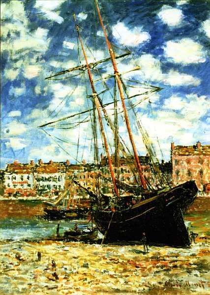 На данной картине Клода Моне изображен летний полдень и рыбачья лодка, вытащенная на берег. Скорее всего, это Гавр в Нормандии. Семья Моне переехала из Парижа после рождения Клода в небольшой городок Гавр. Здесь прошло его детство, здесь он начал рисовать. Детские карикатуры сына отец с успехом продавал в своей лавке. На морском побережье Моне познакомился с известным пейзажистом Эженом Буденом, который может считаться одним из провозвестников импрессионизма. Он показал юному художнику некоторые приемы живописной работы с натуры. Позднее, уже став профессионалом, Моне изобразил море в Нормандии на картине, которая стала своеобразным манифестом и дала название новому направлению в живописи. После смерти первой жены Камилы Донсье художник женился во второй раз на Алисе Ошеде, с которой ранее, в 1883, уехал в местечко Живерни в Верхней Нормандии, где окончил свои дни. На полотне запечатлена типичная картина для побережья Нормандии, когда во время сильного отлива, характерного для этих мест, рыбацкие шхуны оказываются на берегу. Голубое небо с легкими облаками передают яркий полдень на побережье в Гавре.