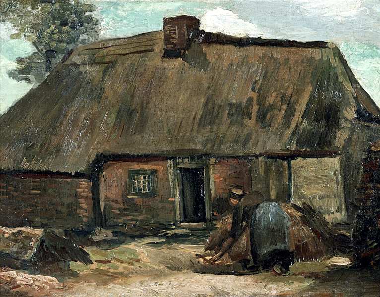 Желание рисовать пришло к Винсенту Ван Гогу, не имевшему никакого специального художественного образования, в возрасте 28 лет. К этому времени он успел поработать и успешным брокером, и миссионером, и учителем, и продавцом в книжном магазине. Скорее всего, особый психический склад Ван Гога стал причиной его обращения к изобразительному творчеству. Он учился в Академии художеств в Брюсселе (1880–1881), а затем в Антверпене (1885–1886). Уже в ранних работах, написанных в темной колористической гамме, чувствуется болезненно острое восприятие живописцем реальности. В 1886 Ван Гог переехал в Париж, где поступил в частную художественную студию знаменитого педагога П. Кормона. В течение двух лет он изучал живопись, увлекался импрессионизмом и японской гравюрой. В этот период палитра мастера стала светлой, исчезли краски землистого оттенка, появились чистые голубые, золотисто-желтые, красные тона, динамичный, как бы струящийся мазок. В 1888 Ван Гог переехал на юг Франции, в город Арль, где поселился вместе с Полем Гогеном. Здесь окончательно сложился своеобразный стиль художника, характеризующийся особым энергичным мазком. На данном пейзаже изображен старый крестьянский дом, крытый соломой. Перед ним расположена копна соломы, рядом с которой, согнувшись, стоит немолодая женщина с лопатой. На картине и жилище, и фигура крестьянки, и земля выдержаны в одной цветовой гамме, в которой отчетливо просматривается депрессивное состояние, ставшее причиной душевного заболевания художника.