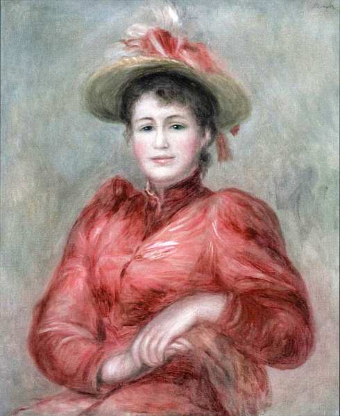 Французский художник Пьер Огюст Ренуар — один из основных представителей импрессионизма. Он проявлял интерес к живописи еще с 13 лет, помогая семье, научился расписывать фарфор. В 1862 Ренуар поступил в Школу изящных искусств, где записался в мастерскую Глейра. Там он познакомился с А. Сислеем, К. Моне, вскоре подружился с П. Сезанном и К. Писсарро. После закрытия мастерской в 1864 художник начал самостоятельное творчество. Несмотря на то что некоторые его работы были приняты на Салон, он критически рассматривал свои успехи. Ренуар был участником первой выставки «непризнанных». Хотя она не принесла организаторам заказов, славы и денег, Ренуар продолжил активную работу в выбранном направлении. Однако постепенно он отошел от кружка импрессионистов и с 1879 снова стал выставляться на Салоне, на этот раз получив официальное признание. Ренуар относится к числу немногих импрессионистов, заслуги которых были высоко оценены еще при жизни. За свое творчество он был награжден орденом Почетного легиона. Во время написания данной картины в стиле художника наметились новые перемены. Работа относится к «перламутровому периоду», называемому так потому, что в живописной манере мастера появляется переливчатость цвета. В этом портрете Ренуар нашел удивительно гармоничное сочетание костюма женщины и фона.Искусство XX века
