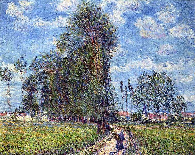 Представитель понтавенской школы Гюстав Луазо относится к плеяде французских художников, чье формирование пришлось на конец XIX — начало XX века. В это время на смену классицизму с его академическими установками нареализм пришел импрессионизм, пытавшийся передать минутное настроение, формирующийся на основе оптического восприятия света. Вслед за импрессионистами появились постимпрессионисты, которые в своих экспериментах с цветом, светом и формой пошли еще дальше. Наряду с Парижем, являвшимся центром культуры и искусства, большим успехом среди мастеров пользовались небольшие городки, где жизнь была значительно дешевле, чем в столице, а живописные окрестности давали возможность проводить много времени на пленэре. Городок Понт-Авен в Бретани стал популярен в художественных кругах еще в середине XIX века, когда его облюбовали парижане для летнего отдыха. Но с начала 1880-х здесь стали останавливаться не только французы, но и американцы, англичане и поляки. В Понт-Авене были созданы художественные галереи и развита торговля картинами. Представителей понтавенской школы можно назвать постимпрессионистами. В этой картине, как и в большинстве работ Густава Луазо, прослеживается влияние пейзажей К. Писсарро и пуантилизма Ж. Сёра. На полотне изображена дорога, тянущаяся между полей в деревушку Прейяр в кантоне на севере Франции. По ней идут крестьяне с корзинами, вдоль дороги растут деревья. Картина передает гармонию летнего солнечного дня.