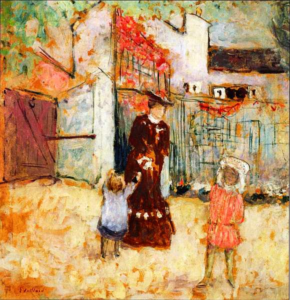 Французский символист Жан Эдуар Вюйар в детстве был тихим юношей, которого окружал мир тканей и моды. После окончания лицея он поступил в художественное училище, где встретился с Пьером Бонаром. С 1886 Жан учился в Школе изящных искусств и академии Р. Жюльена в Париже. В 1892 совместно с Морисом Дени и Кер-Ксавье Русселем он основал группу Наби (с древнееврейского — «пророк, избранный»). Творчество художников этой группы характеризуется главенством цветового начала, декоративностью, обобщенностью форм, плоскостной стилизацией, в которой просматривается влияние народного примитива и японской гравюры. Однако в живописи Вюйара прослеживаются черты формирующегося символизма. Так, художник сотрудничал с символистским журналом «Ревю бланш». На данной картине изображена женщина с двумя детьми на улице захолустного городка. Маленький ребенок тянется обеими руками к матери — даме в длинном коричневом платье и шляпке. Второй ребенок — девочка-подросток — стоит чуть в стороне. При всей обыденности сюжета благодаря палитре и схематичности рисунка полотно приобретает символическое звучание. В своих полотнах живописец прошел эволюцию от подражания голландцам XVII века до импрессионистов, затем к постимпрессионизму и символизму.